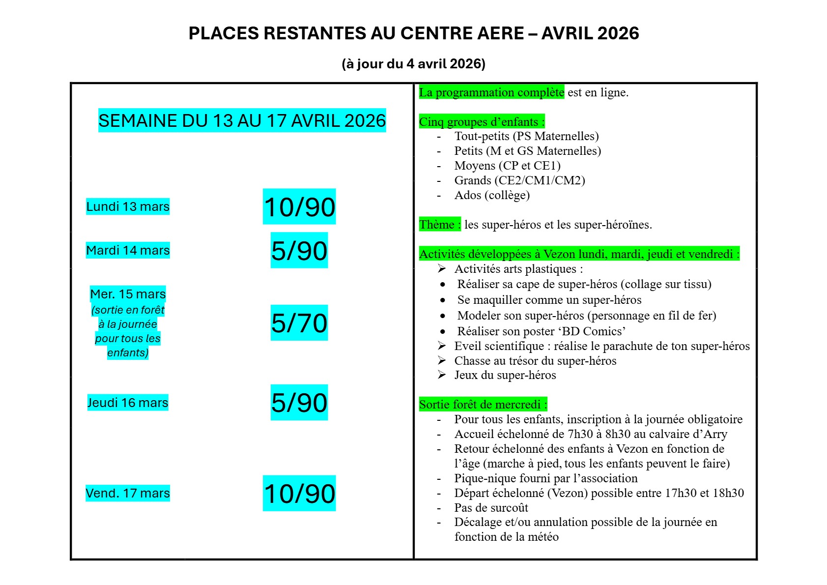 Tout savoir sur les horaires, la composition des groupes d’enfants, les activités proposées, les sorties, les éventuels suppléments tarifaires, etc.